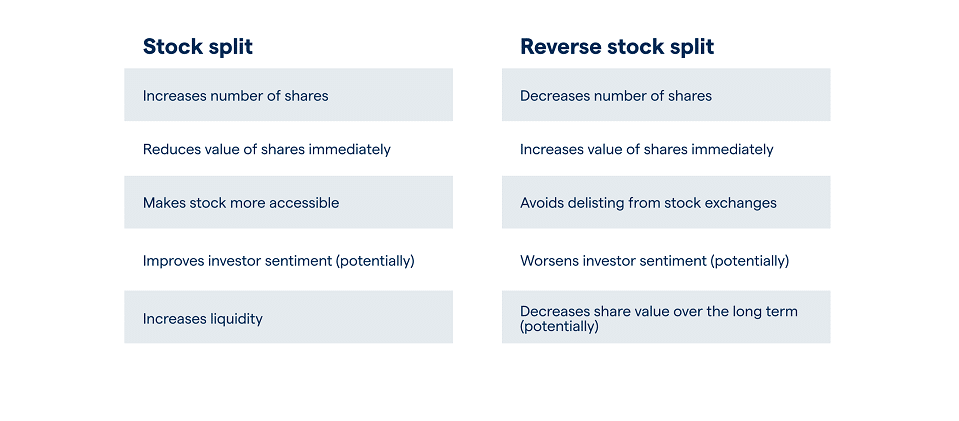 A reverse stock split works in the opposite way. In this case, the company reduces the number of shares by consolidating them. A 1-for-10 reverse split means an investor who holds 10 shares will now have just 1, but the price per share increases tenfold. Again, the overall value stays the same.